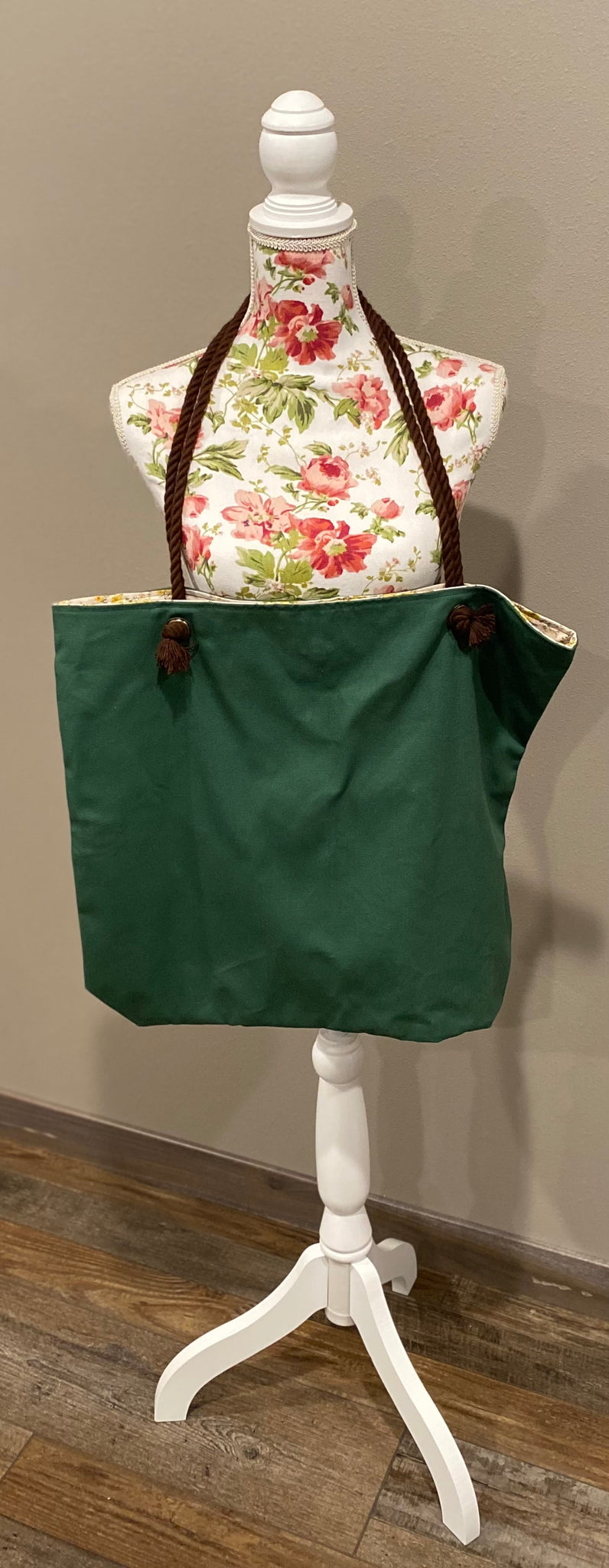 Green shoulder bag with brown straps and floral print on the inside. Great for many different things like grocery bag, daycare bag, office bag, and overnight bag to name a few.